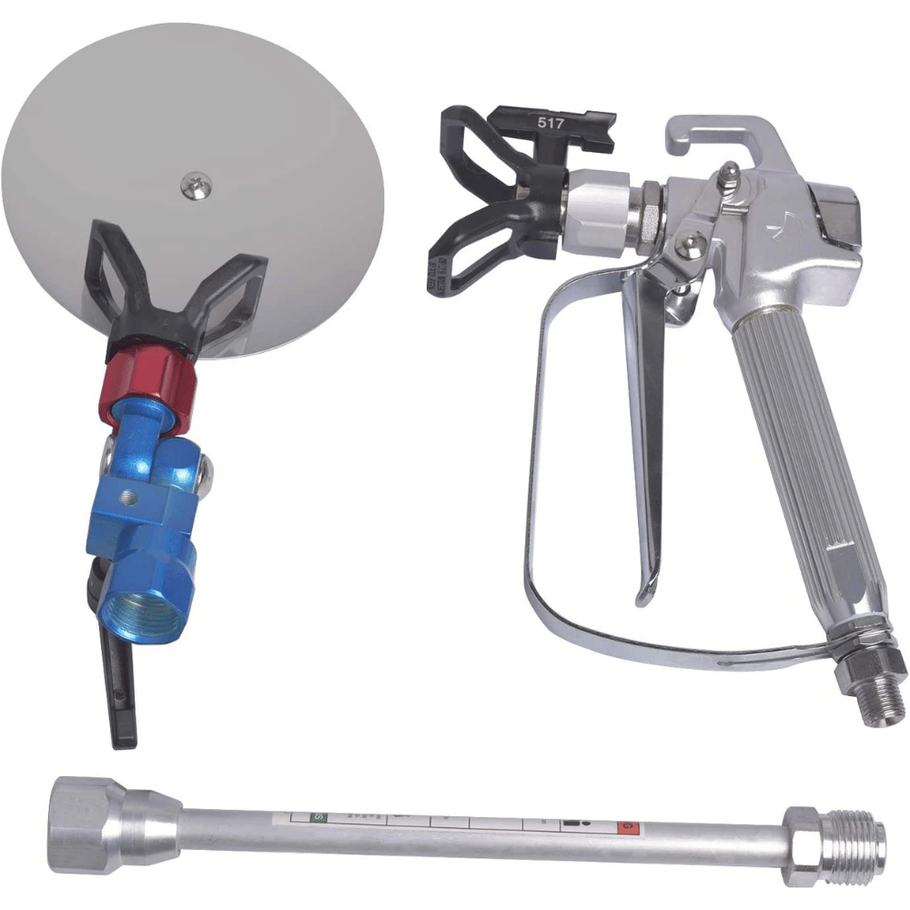 The spray guide works for airless sprayers with 7/8” thread size and consists of a 180-degree swivel, tip guard, 517 spray tip, tip seal, a freewheeling disc and an extension pole.