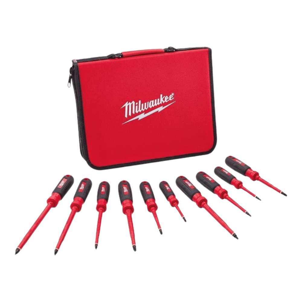 The Milwaukee 1000-Volt insulated screwdriver 10-piece set and case offers many features that electricians look for. It is equipped with VDE and GS certification, ensuring reliable protection of up to 1,000 volts. This means you can safely work with electrical components without the risk of shock or injury. When working with live wires, insulated tips can protect users from electrical shock. The screwdrivers are made with alloy steel, which makes them durable. It also includes an EVA foam carrying case, which helps with organization and protects the items from wear and tear when they are not being used.