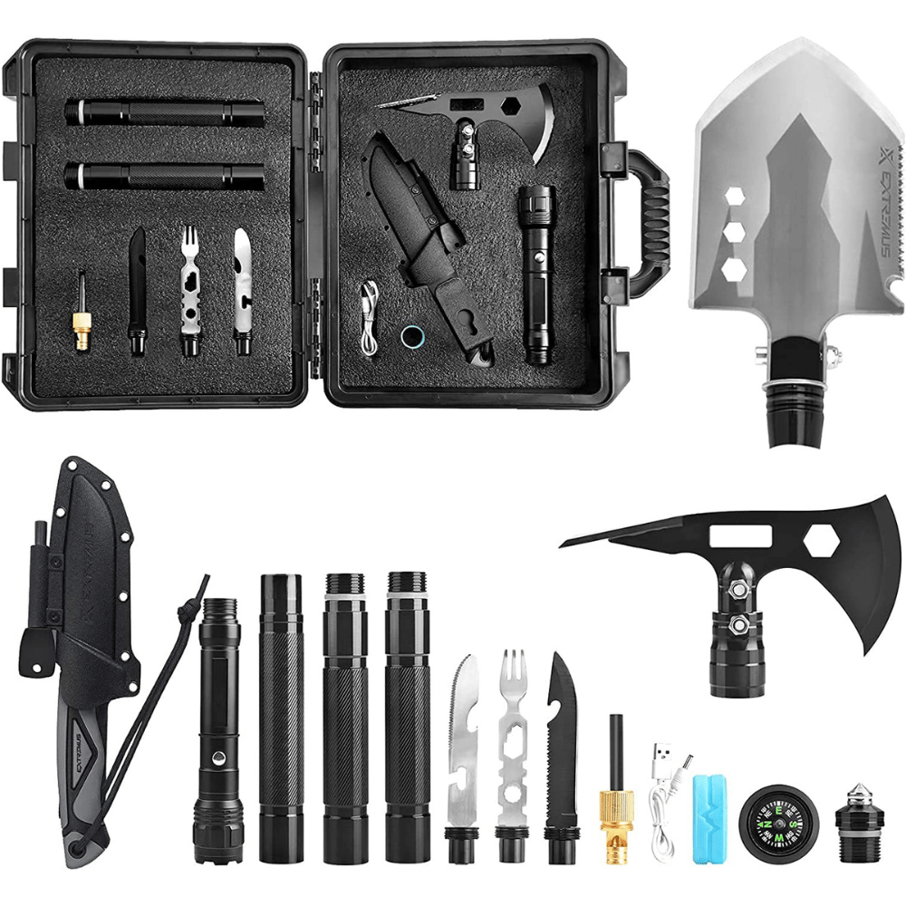 The kit comes with a steel shovel with serrated edge, multi-function axe, flashlight, serrated knife blade, multi-function fork and knife, magnesium fire starter with whistle and compass, glass breaking cone, hex wrenches and aluminum extension handles.